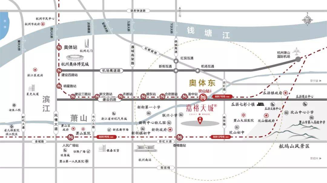 地铁7号线公里设置坎山站,从坎山站出发,9站到达奥体,一刻即达滨江;7号线号线换乘,享受泛杭全线配套,换乘即达城站火车站、萧山国际机场等交通枢纽,自在往返钱江新城、奥体。