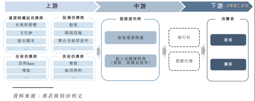 我国水上游览产业链上游供应商包括提供水域经营权、文化IP、演出剧本等资源的,提供船只、码头设施、舞台及厨房套件等设备的,提供云与SaaS解决方案及导航系统的,以及供应餐饮及船用燃料的厂商。