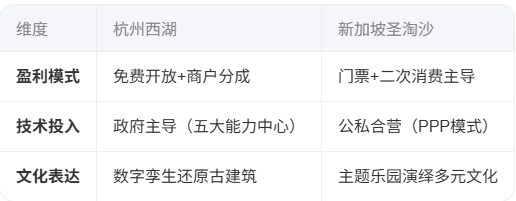 技术互补:西湖可借鉴圣淘沙的娱乐化设计,圣淘沙需引入西湖的精细化管理能力。