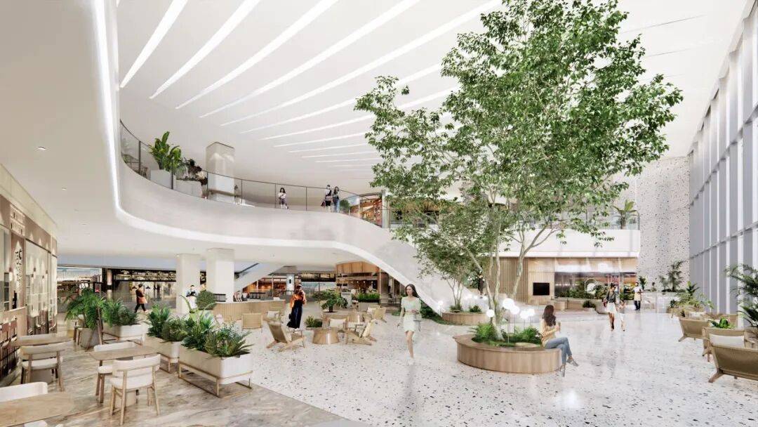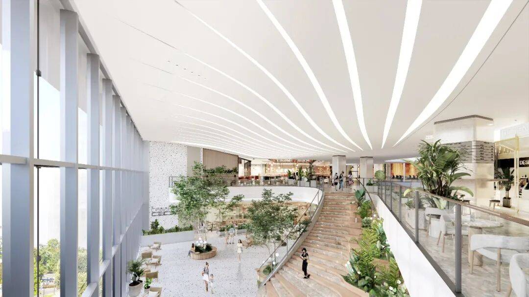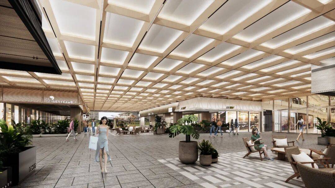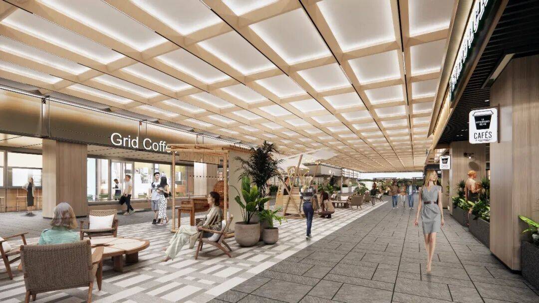 设计团队以江南街巷为原型,在两侧商铺间植入层次丰富的绿植景观,搭配错落有致的防腐木休憩座椅。业态布局上预留了精品咖啡、烘焙及网红轻餐的规划,消费者在品尝美食时,透过玻璃便可望见街巷绿植,实现食景相融的体验。让丰收茶话巷未来将成为邻里闲谈、好友小聚的首选地,真正实现生活新五感的沉浸式体验。