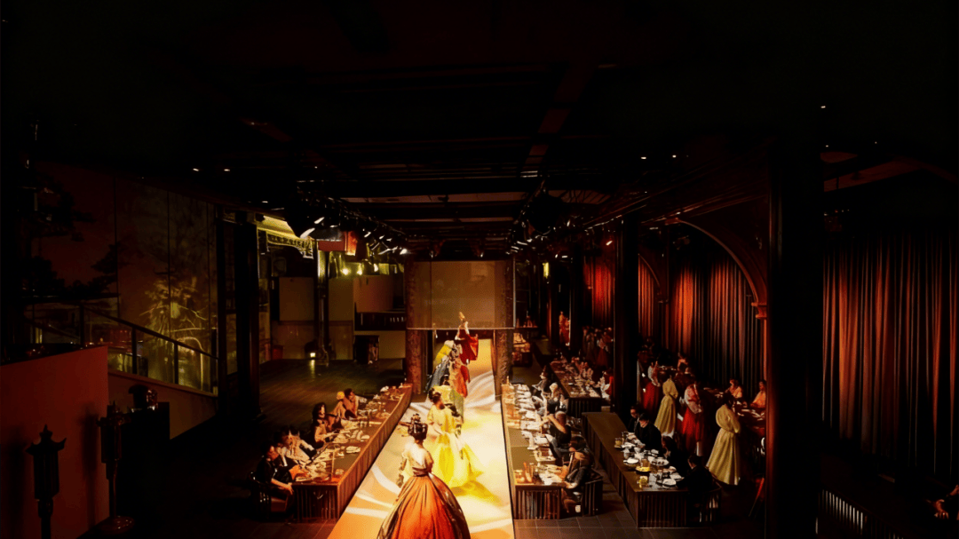 位于东郊记忆·国际时尚产业园,以“蜀地江湖”为主题,融合“茶馆、武馆、酒肆”元素,墙面挂有“蜀绣”“竹编”等非遗装饰,将工业遗存的粗犷与汉唐风华的典雅完美融合,营造出独特的文化氛围。剧情主线围绕汉、唐、宋三朝宴饮礼仪展开,场景布置与主题紧密贴合。食客可席地而坐,仿佛穿越回古代。菜品融合了川菜文化与古宴形制,独具特色。餐厅通过乐舞演绎、光影艺术、汉服体验等多种形式,打造了一场集餐饮、文化、演艺于一体的沉浸式盛宴。食客可自由互动演绎角色,参与剧情推进,在光影艺术与乐舞表演的加持下,仿佛穿越回古代宫廷夜宴,感受千年礼乐文化的魅力,成为成都文旅融合的标志性项目。