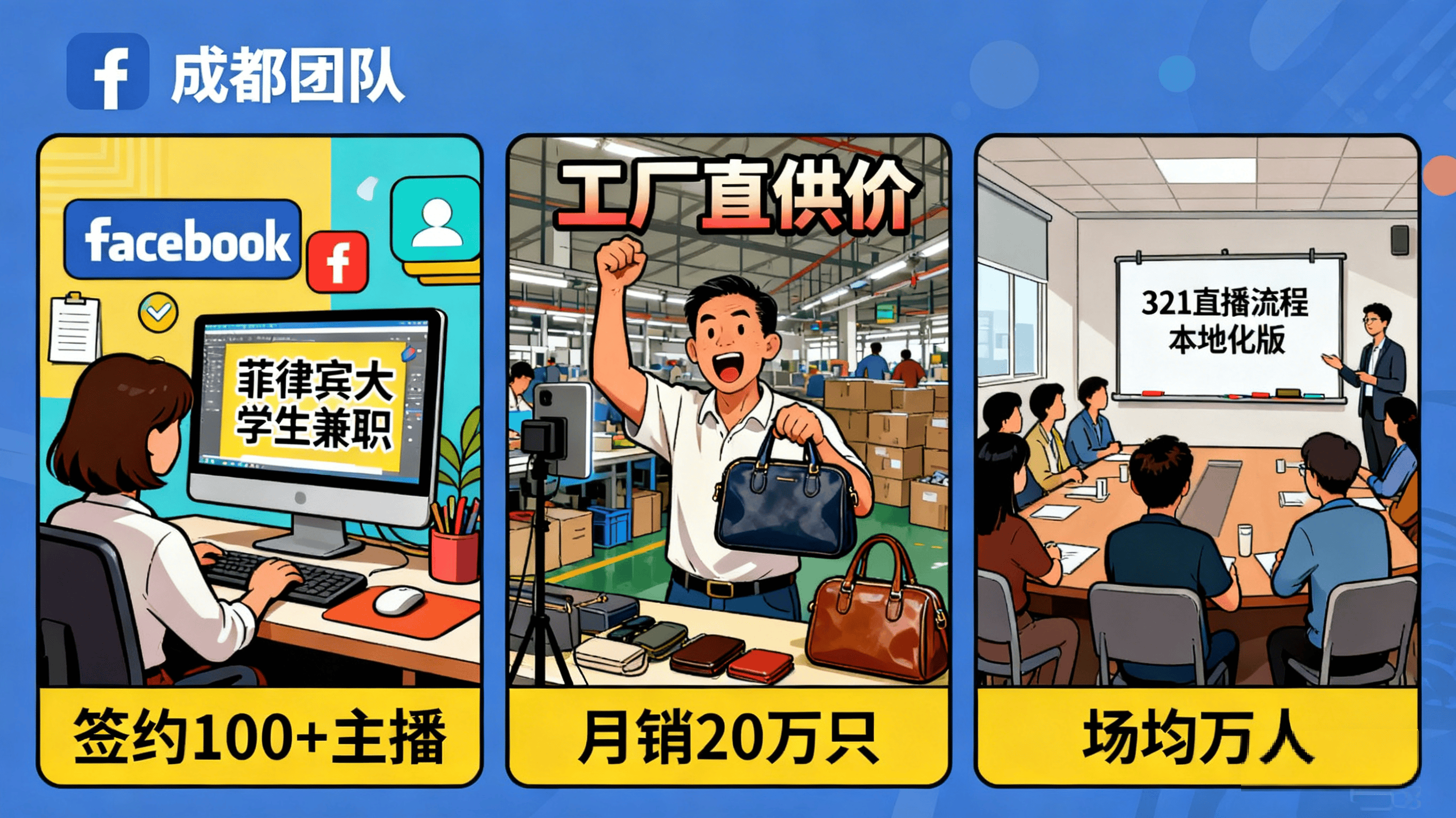 成都 95 后团队 “野路子公会”,没有海外资源,却通过 “3 步素人改造法” 在菲律宾市场成功:① 在 Facebook 群组招募 “会说中文的菲律宾大学生” ② 用 “直播话术模板 + 场景化脚本” 培训 7 天 ③ 主打 “中国零食测评” 垂直赛道,单场 GMV 从 500 美元做到 5 万美元,6 个月签约 100 + 主播。