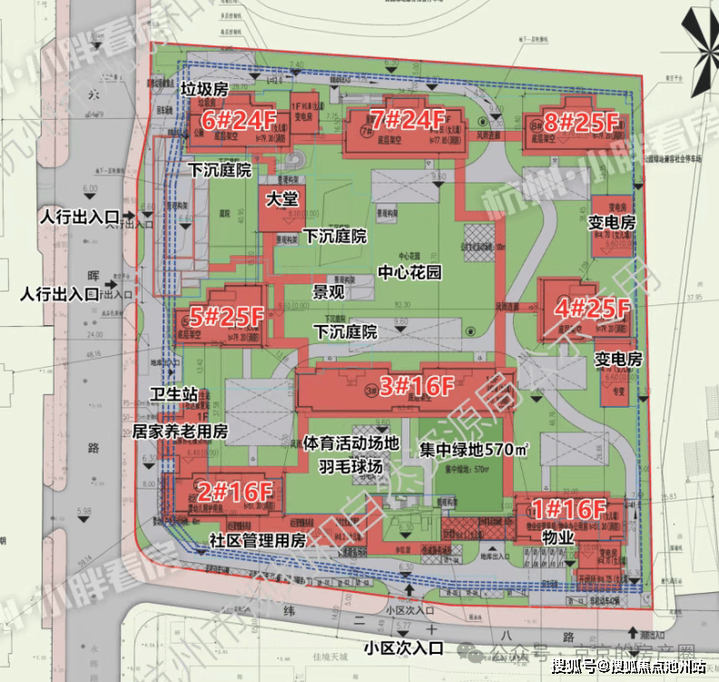 公区规划有下沉式庭院、地下会所、全域风雨连廊、中心花园等,主出入口位于西侧永晖路,距离地铁口更近的次出入口位于小区南侧。