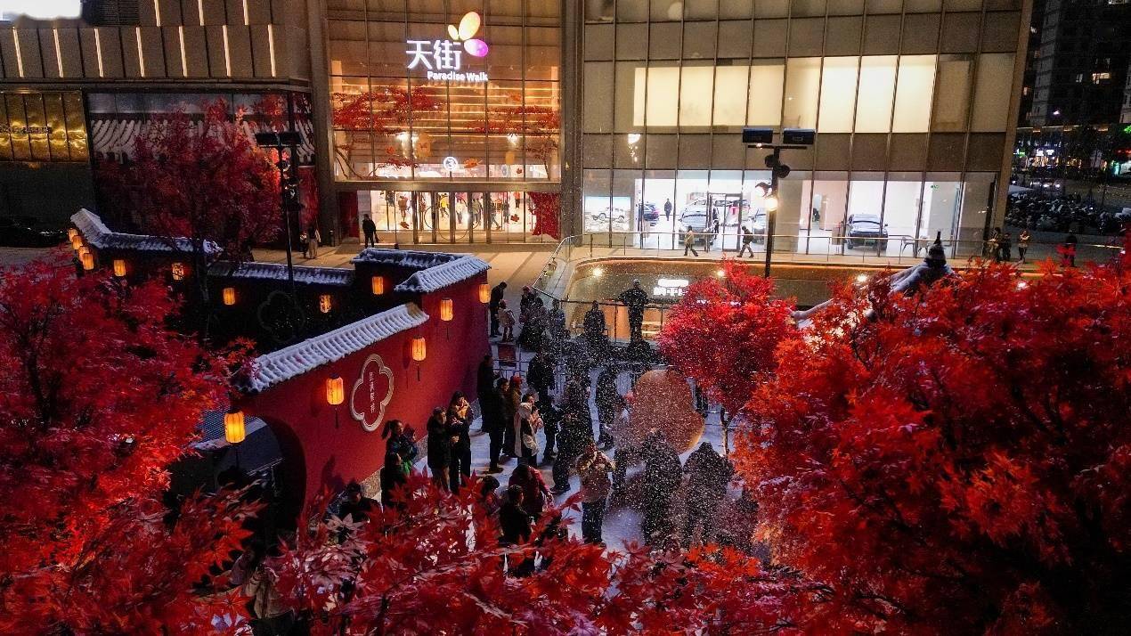 今年初,龙湖宁波鄞州天街的“红枫庭院”火出圈。中国红墙面与园林飞雪相映,灯笼点缀夜景,迅速成为地铁口旁的热门打卡点。