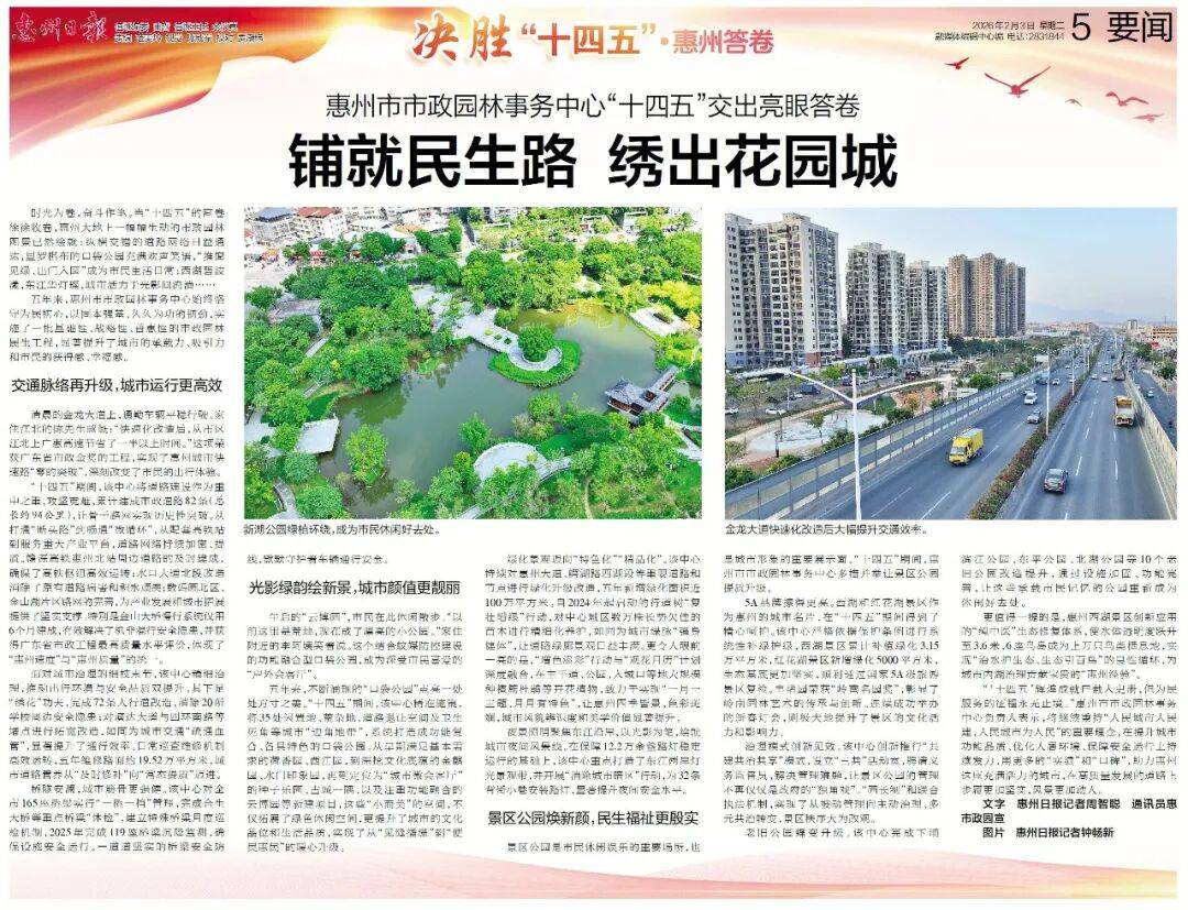 “‘十四五’辉煌成就已载入史册,但为民服务的征程永无止境。”惠州市市政园林事务中心负责人表示,将继续秉持“人民城市人民建,人民城市为人民”的重要理念,在提升城市功能品质、优化人居环境、保障安全运行上持续发力,用更多的“实绩”和“口碑”,助力惠州这座充满活力的城市,在高质量发展的道路上步履更加坚实,风景更加动人。