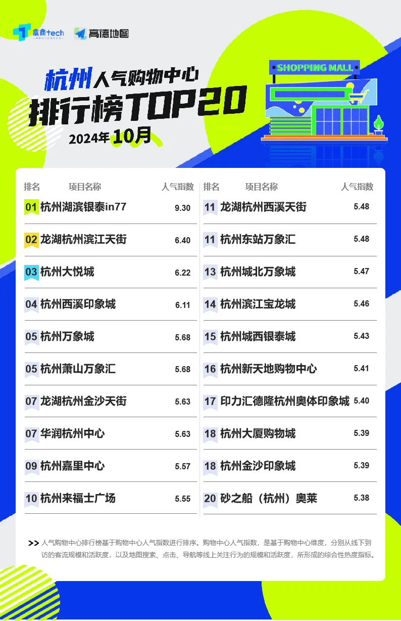 《人气购物中心排行榜》排序基于“购物中心人气指数”,综合测评线下到访客流规模、活跃度,及地图搜索、点击、导航等线上关注行为的规模和活跃度,形成综合性热度指标,以量化数据为项目调改、品牌选址等给予参考,提升行业数智化决策效率。