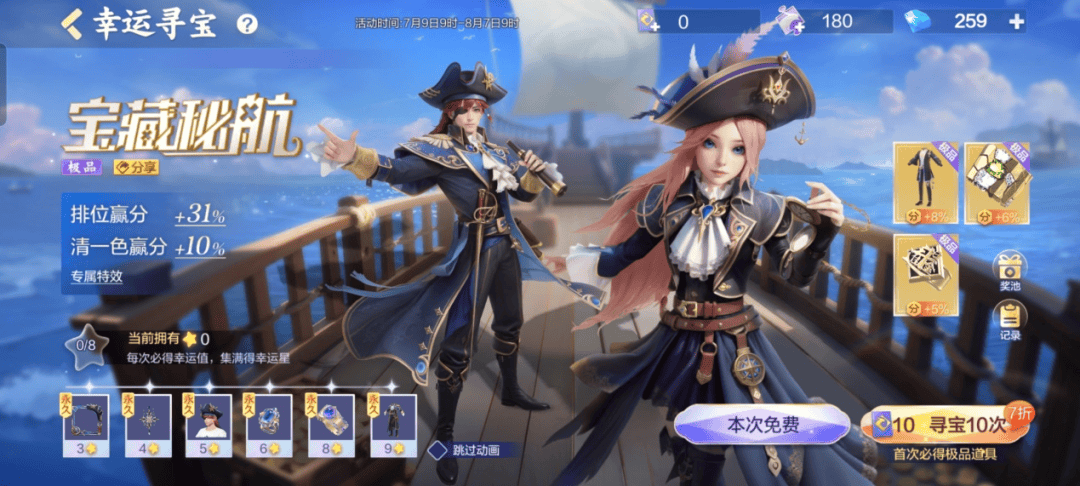 目前【宝藏秘航】极品时装仅能通过幸运寻宝活动获得,麻友们购买幸运寻宝礼包可以获得附赠的幸运寻宝紫券,也可以使用幸运寻宝紫券碎片兑换。每次使用寻宝紫券参与活动,都可以获得幸运值,幸运值越高获得极品道具的概率越大哦!